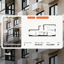 Продаётся 2-комн. квартира площадью 70,1 кв.м на 11 этаже 12 этажного дома (Корпус 4.1, Секция 1) проекта ПИК Таллинский парк. Светлый просторный подъезд на уровне земли, функциональная планировка, большие окна, без отделки.