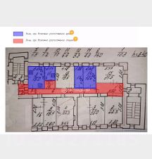 В фотографиях есть планировка с информацией, где  можно законно разместить зоны кухни (фиолетовый цвет) и зоны сан.узлов (красный цвет)