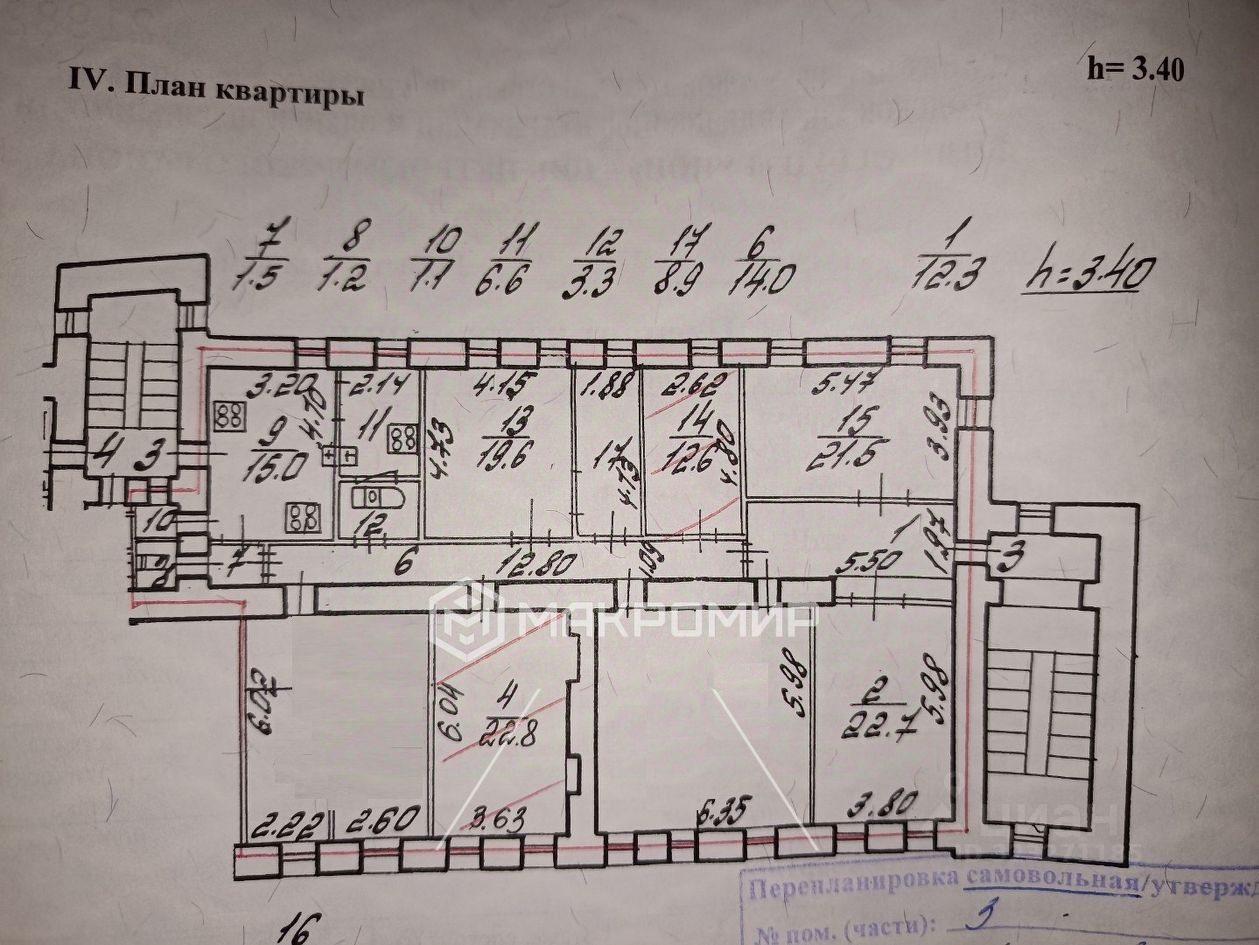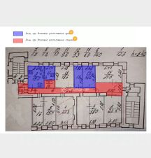 В фотографиях есть планировка с информацией, где можно законно разместить зоны кухни (фиолетовый цвет) и зоны сан.узлов (красный цвет)