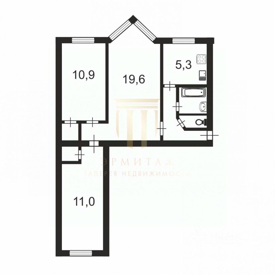 Квартира находится в хорошем состоянии, чистая и ухоженная. Общая планировка включает просторную гостиную с эркером площадью 19,6 кв.м., спальню площадью 11,1 кв.м. с собственной гардеробной, а также вторую спальню (детскую) площадью 10,9 кв.м. В прихожей предусмотрено кладовое помещение. Кухня площадью 5,3 кв.м. оснащена газовой колонкой.