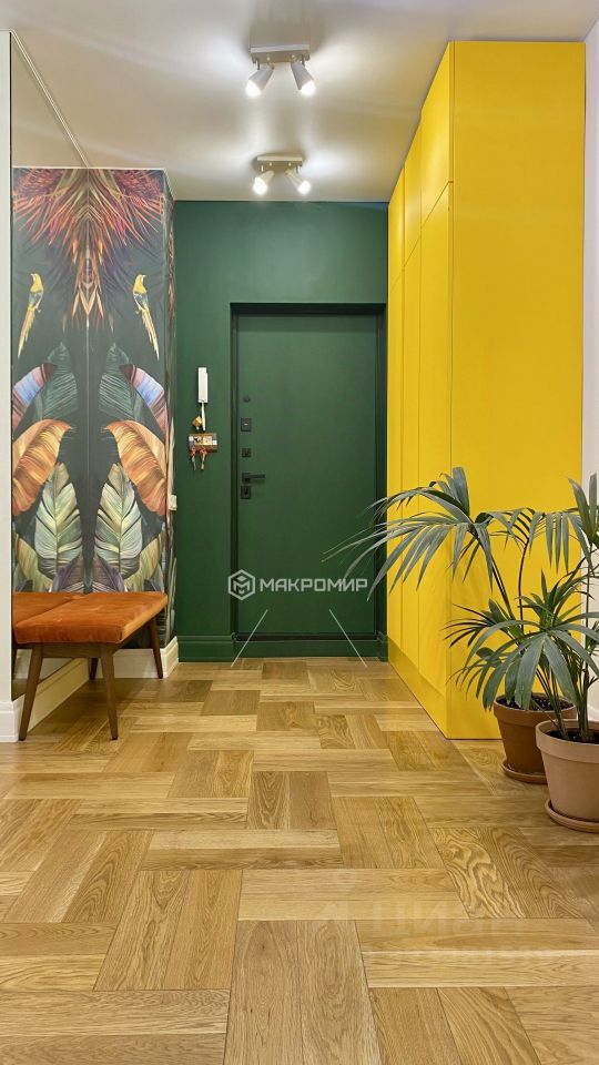 На полу инженерная доска (Lab Arte) (Дуб натуральный), уложенная елочкой по всей квартире (кроме мокрых помещений);