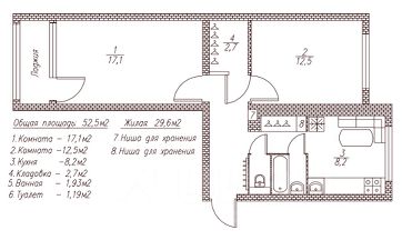 Маленькая комната с кухней выходят на восток, большая комната на запад. Общая площадь квартиры 52,5 (жилая 29,6) кв. м., из которых: кухня 8,2 кв. м., комнаты изолированные 17,1 + 12,5 кв. м., санузел раздельный (туалет 1,19 кв. м. и ванная 1,93 кв. м.), кладовая 2,7. Высота потолков 2,6м. На кухне установлен счетчик газа. Двух-тарифный электросчетчик находится в электрощите на лестничной площадке. Счетчики воды расположены за декоративными дверьми деревянного шкафа в туалете.