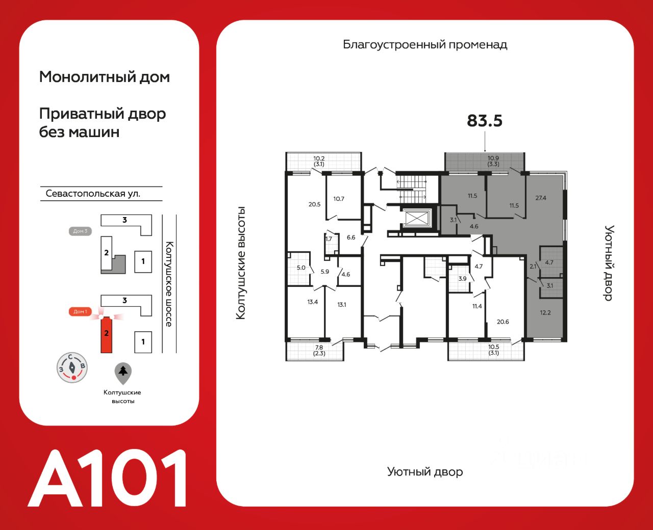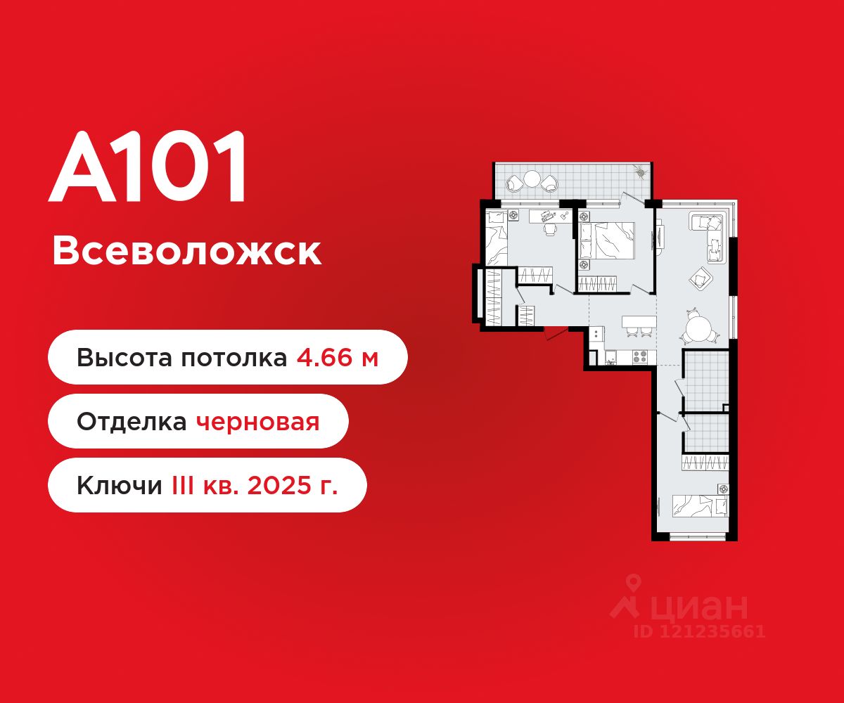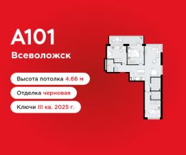 2-комнатная квартира площадью 83.50 в ЖК "А101 Всеволожск" c лоджией на 1 этаже. Квартира без отделки. Вид из окна во двор. В квартире 2 санузла. Высота потолков 4.66 м. Особенность планировки - мезонин и патио, гардеробная, мастер-спальня.