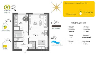 В продаже просторная однокомнатная квартира 35,9 кв м.