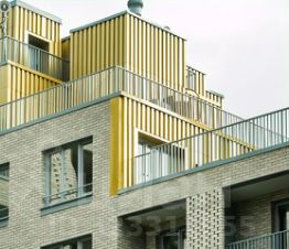 Современный дом с плоским фасадом из клинкерной плитки, правильные геометрические формы, ламели и золотистые террасы придают архитектурную легкость. Угловое витражное остекление и стильная 3-уровневая подсветка арт-объектов образуют выразительный экстерьер. Здание поднимается ступенями с 3 до 9 этажей, формируя приватную территорию с зонами для отдыха, спорта и работы на свежем воздухе.