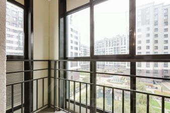 Сам корпус расположен максимально от проспекта, в сторону реки. В квартире панорамное остекление, балкон застеклен по финской безрамной технологии Lumon, эксплуатируются бесшумные Лифты "Коне". Всего три квартиры на этаже. Комнаты правильной квадратной формы  самой удобной для зонирования, в спальне  два окна.