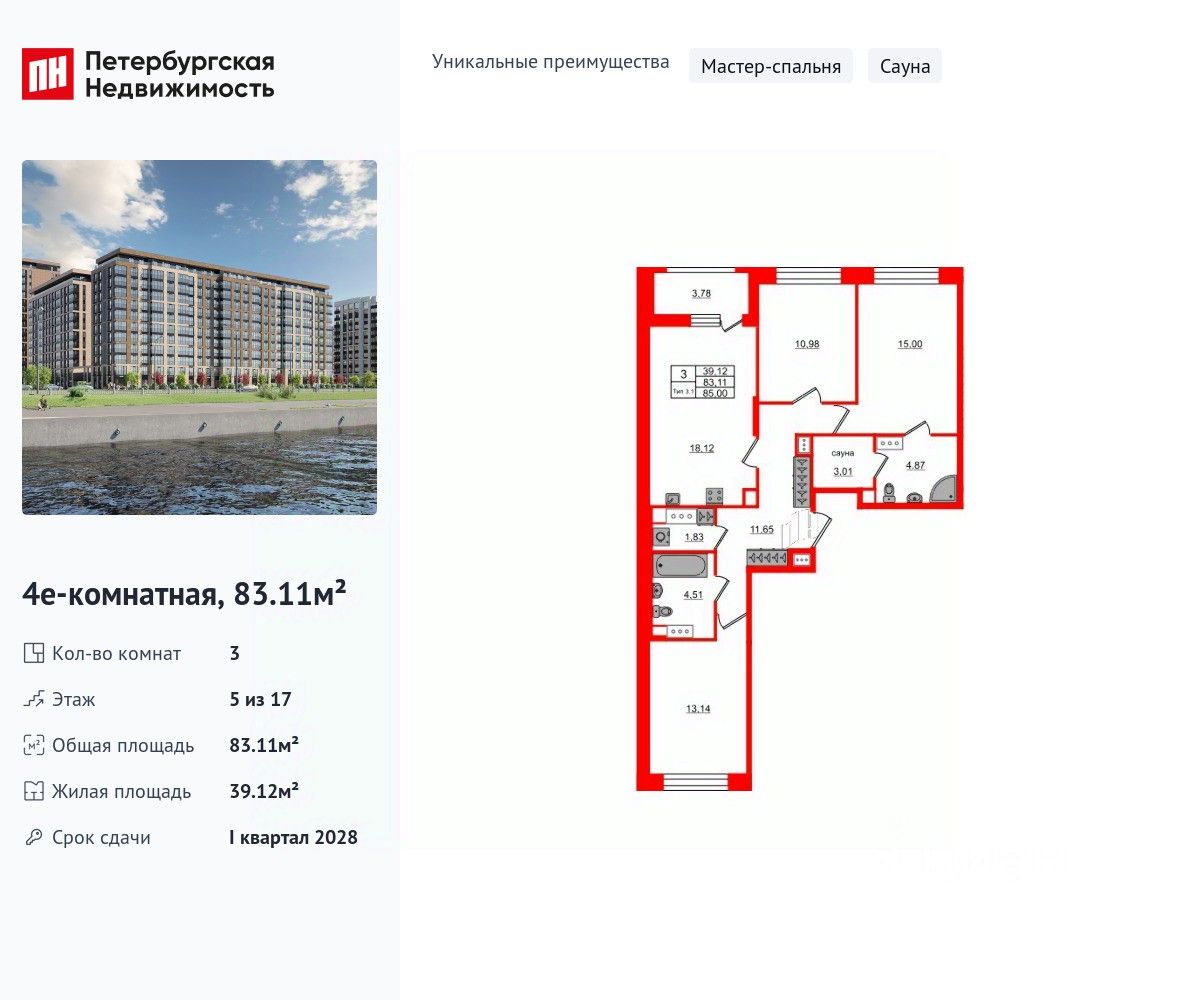 Уникальная, функциональная европланировка, большая кухня-гостиная 18.12 м², вместительная прихожая 11.65 м². Общая площадь квартиры - 83.11 м², жилая 39.12 м², высота потолка 2.77 м.