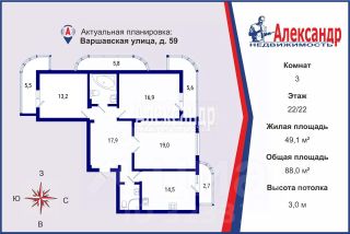 1704899 Предлагается к продаже 3 комнатная квартира в престижном районе Санкт-Петербурга с 2-мя спальнями, просторной залой, большой кухней и коллосальной прихожей. Общая площадь 88 м², высота потолков 3,0 м.