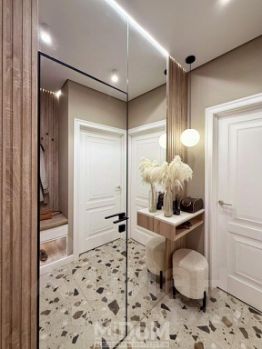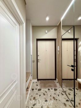 Зеркальная стена в коридоре прячет дверь инвизибл в ванную комнату.. Несколько вариантов освещения в каждом помещении.