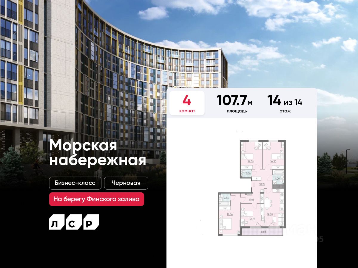 Продается 4-комнатная квартира в ЖК "Морская набережная" на 14 этаже. Общая площадь составляет 107.70 кв. м. Квартира без отделки. Жилой комплекс "Морская набережная" располагается по адресу Санкт-Петербург, Василеостровский.