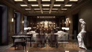 Лобби с ресепшеном и клубная гостиная с камином