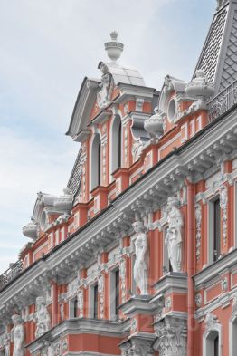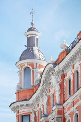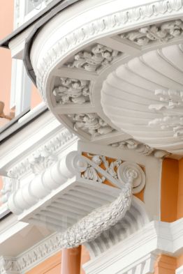 Фасад дома выполнен в стиле нео-барокко: кариатиды, атланты, цветочные гирлянды, зеркальные окна, балконы и эркеры. Каждая деталь подчеркивает статус дома и принадлежность к архитектурной элите Санкт-Петербурга.