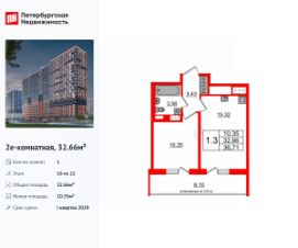 Удобная, классическая, функциональная европланировка, большая кухня-гостиная 15.32 м², вместительная прихожая 3.43 м². Общая площадь квартиры - 32.66 м², жилая  10.35 м², высота потолка 2.77 м.