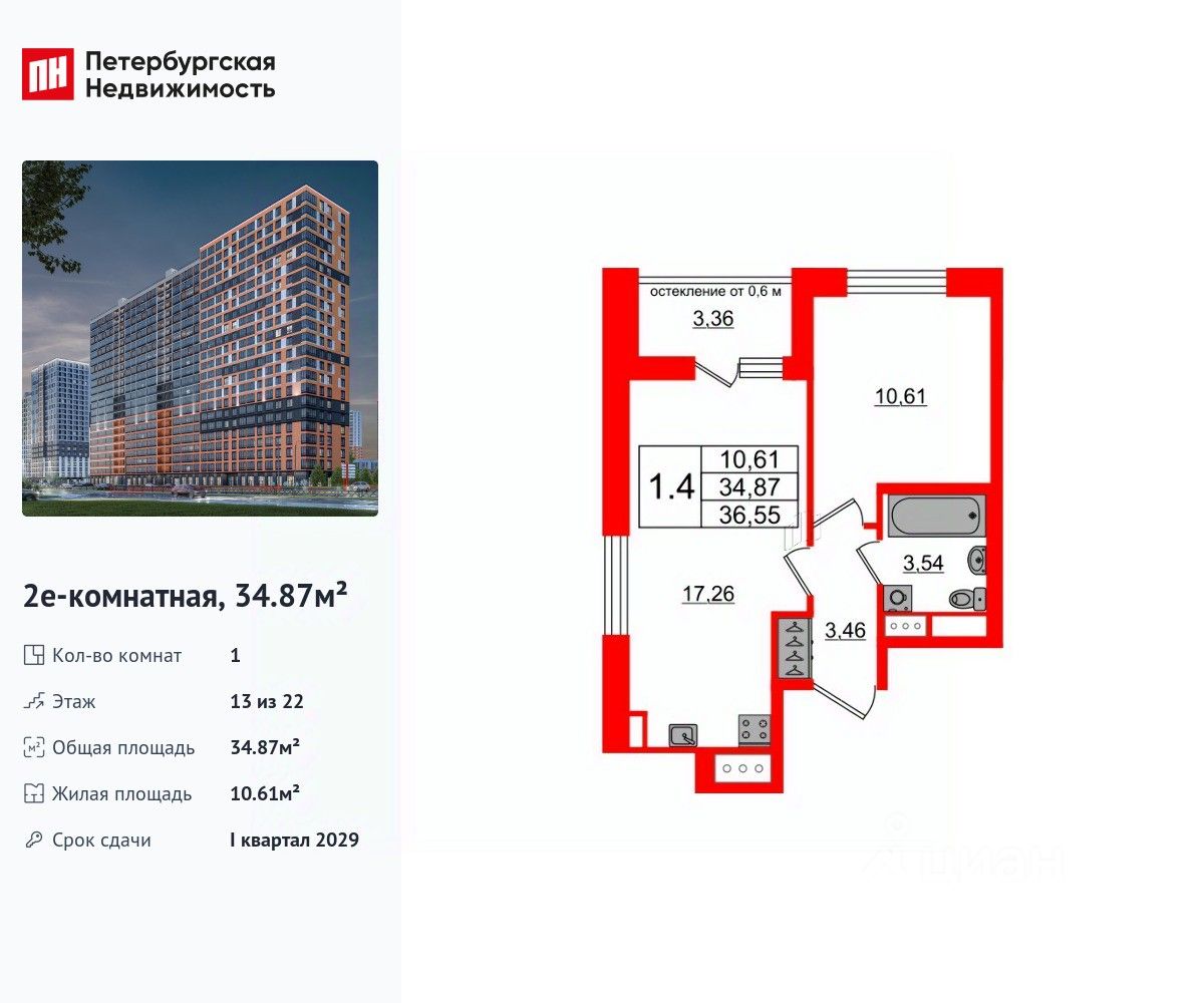Удобная, классическая, функциональная европланировка, большая кухня-гостиная 17.26 м², вместительная прихожая 3.46 м². Общая площадь квартиры - 34.87 м², жилая 10.61 м², высота потолка 2.77 м.