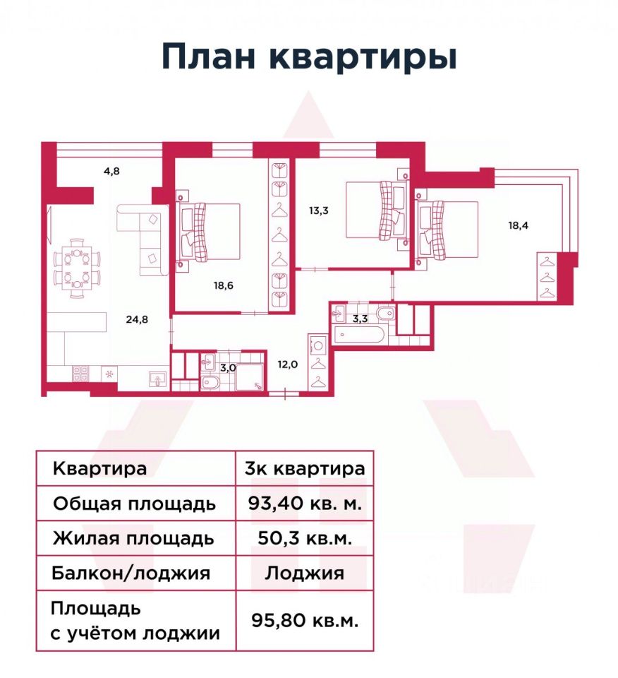 Вас ждет большая кухня-гостиная 24,8 м² — идеальное пространство для семьи и друзей, к которой присоединена полностью утепленная лоджия.