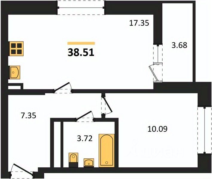 Общий метраж 38,51 кв.м., без учета лоджии.  С учетом лоджии 42,19 кв.м.