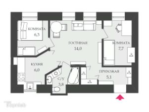 Общая площадь: 42,3 кв.м.