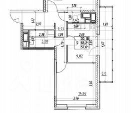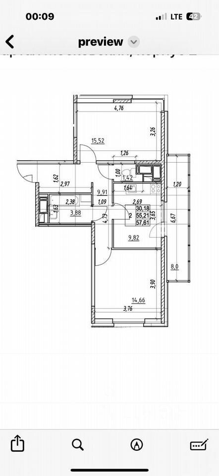 57.7 м², 4/эт., две комнaты 15.52м² и 14.66