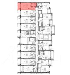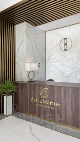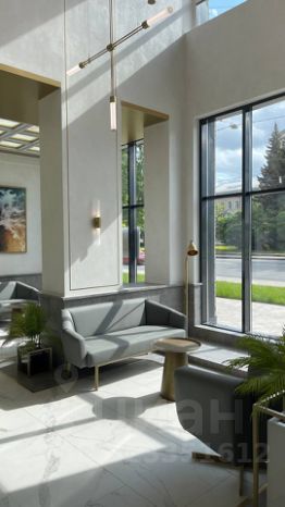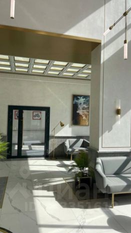 Квартира находится именно в той секции, вход в которую осуществляется через центральную входную группу и лобби с отделкой из керамогранита под мрамор и колоннами с акцентными латунными вставками.