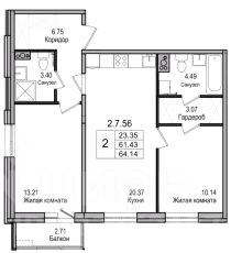 - общая площадь - 61,1 + 2,7 кв. м балкон,