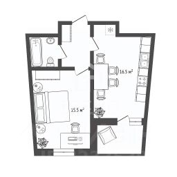 3. Планировка  16,5 м² кухня-гостиная с панорамным остеклением и 15,5 м² спальная зона
