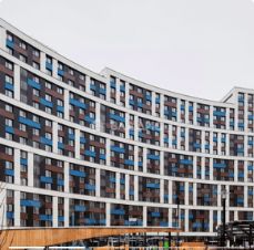 Оригинальная архитектура сочетает плавные изгибы фасадов и благородную цветовую палитру.