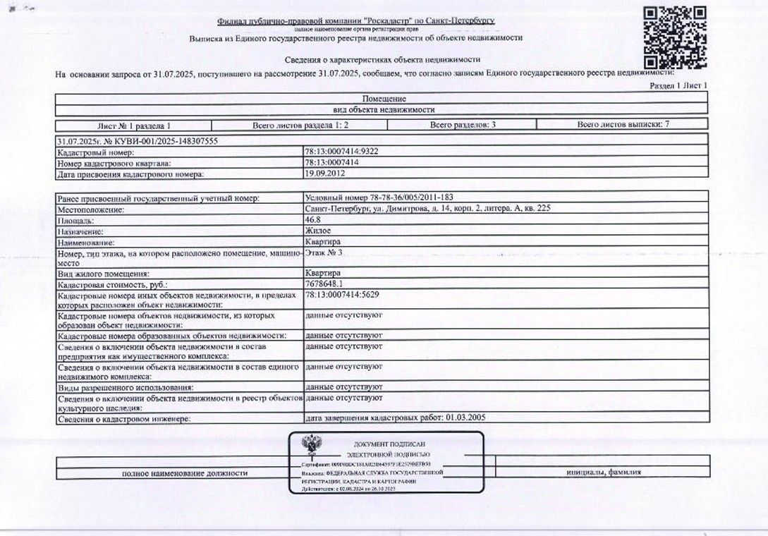 квартира по адресу: г. Санкт-Петербург, ул. Димитрова, д.14, корп.2, лит. А, кв.225, общ. пл. 46,8 кв.м., кадастровый номер 78:13:0007414:9322