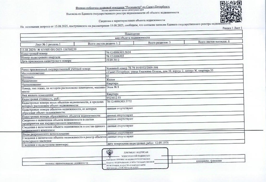 квартира по адресу: г. Санкт-Петербург, ул. Евдокима Огнева, д.10, корп.2, лит. Ж, кв. 55, общ. пл. 61 кв.м., кадастровый номер 78:12:0006303:5834