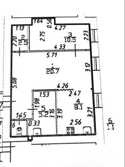 Общая площадь 48,1 м2, кухня 8.1, гостиная 20.7, спальня 10.5, ванная 5.2, гардероб 2.5, туалет 1.1.