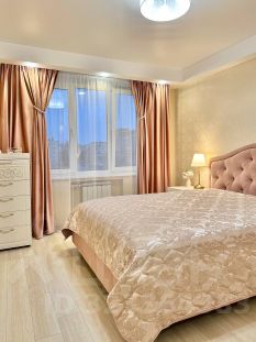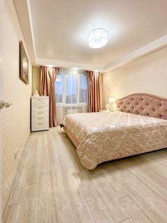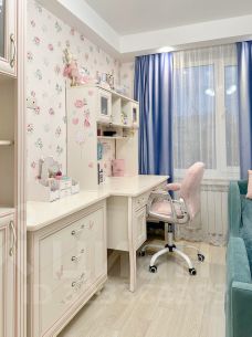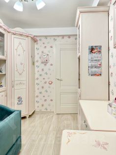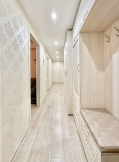 • Входная зона — просторный коридор с большим шкафом-купе; в гостиной — большой круглый стол и диван; в спальне и детской — комфортные кровати, шкафы, тумбы, шторы блэкаут.
