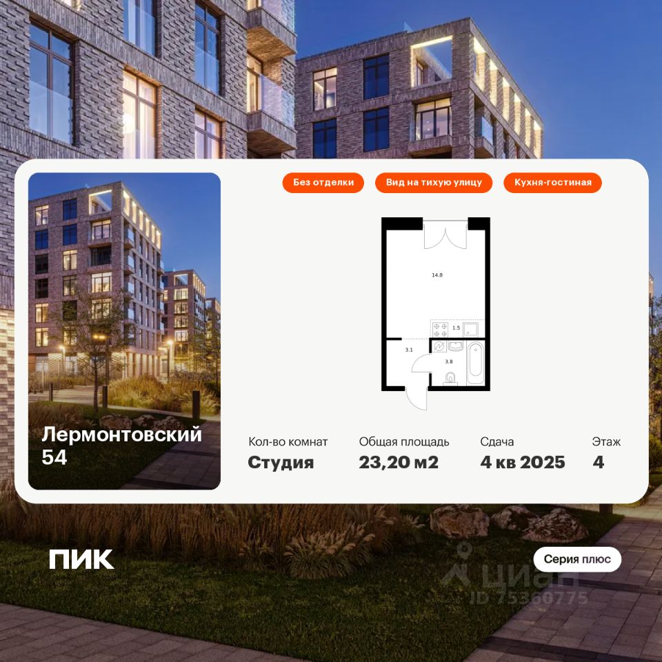 Продаётся квартира-студия площадью 23,2 кв.м на 4 этаже 7 этажного дома (Корпус 2.1, Секция 1) проекта ПИК Лермонтовский 54. Светлый просторный подъезд на уровне земли, функциональная планировка, большие окна, без отделки.
