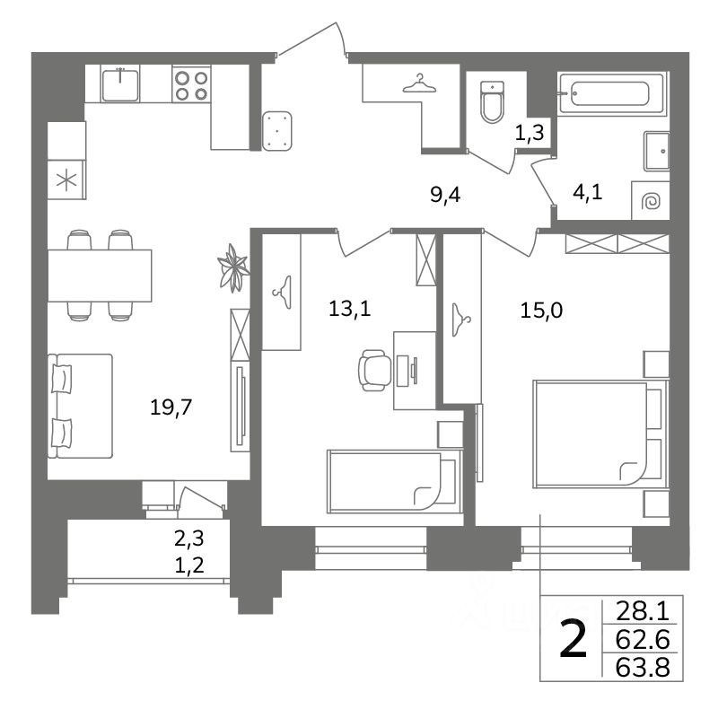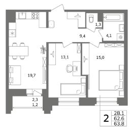 Просторная 2-комнатная квартира 63.8 м² с евро-планировкой в ЖК "Антверпен" от Л1 у м. Купчино