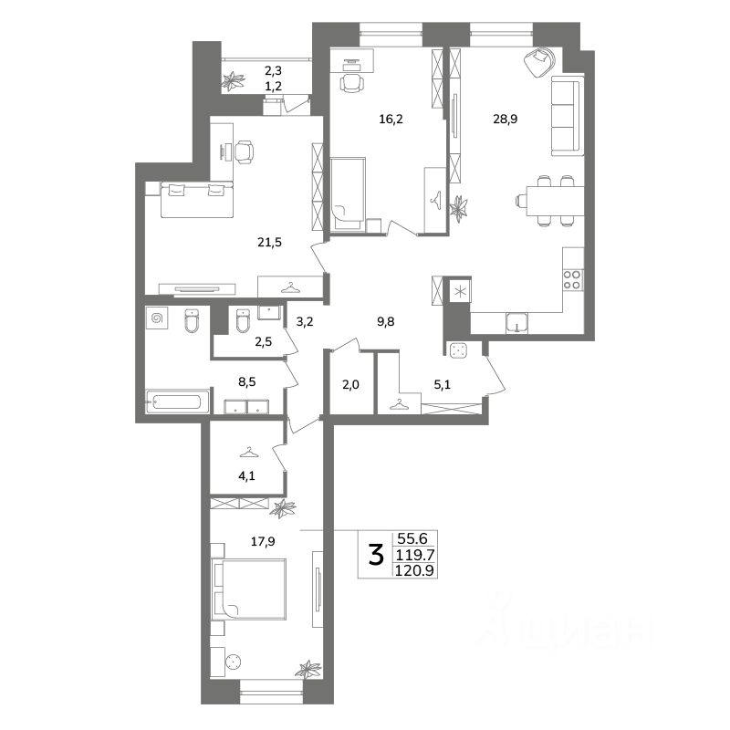 Просторная 3-комнатная квартира 120,9 м² с евро-планировкой в ЖК "Антверпен" от Л1 у м. Купчино