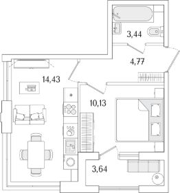 1-комн. квартира, 34,59 м²