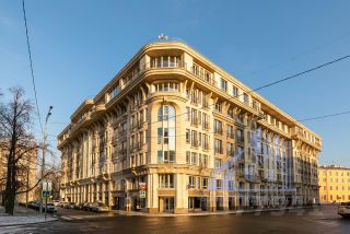 Фасад дома выполнен из натурального камня в стиле неоклассицизм