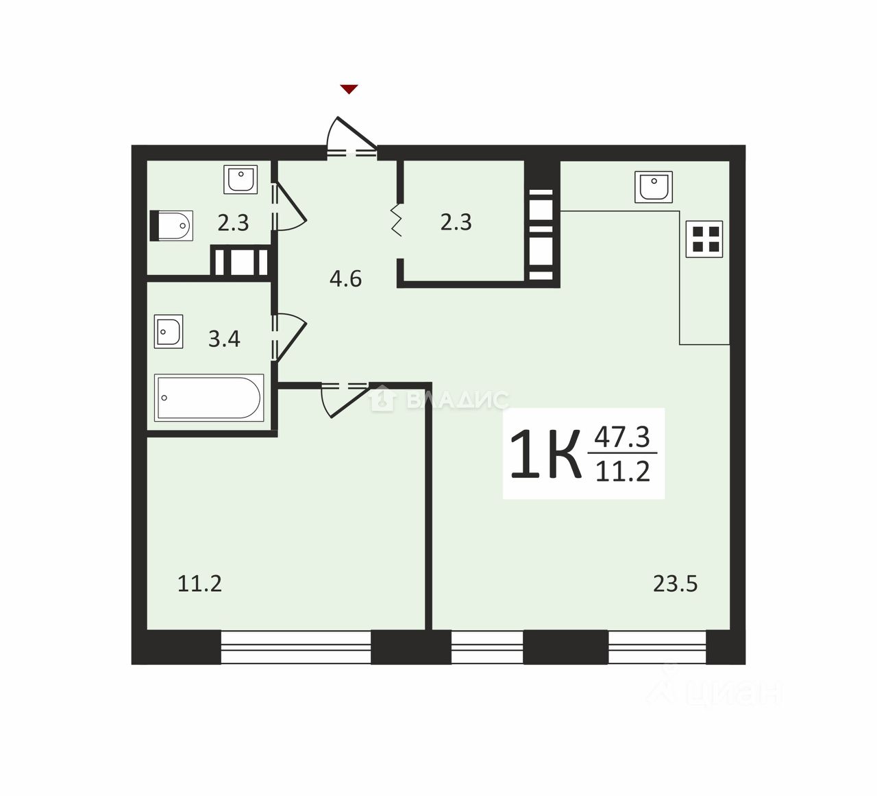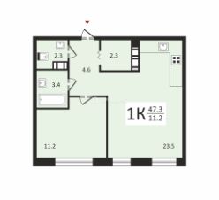 Общая площадь квартиры составляет 47,3 кв. м, из которых 11,2 кв. м приходится на жилую площадь, а 23,5 кв. м — на кухню. Комнаты изолированы, что обеспечивает комфорт и уединение. Окна выходят во двор, поэтому в квартире будет тихо и спокойно.