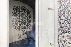 Интерьер оформлен с использованием художественного паркета, мозаики, витражей, лепнины, ценных пород дерева и камня. Установлены система "Умный дом", акустическая проводка, подсветка с 16 сценариями, заложен телевизор в зону джакузи. В санузлах использованы Vellеlungа Ceramica и редкий зеленый оникс. Выполнена акустическая и инженерная подготовка, добавлена мощность электроэнергии 45,5 кВт, смонтирована собственная котельная Viessmann.