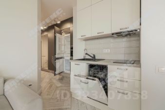 Кухня-гостинная оборудована встроенной техникой (холодильником, плитой, стиральной машиной, духовым шкафом, посудомоечной машиной).  В ней достаточно места, чтобы расположить всю необходимую мебель и принимать гостей.