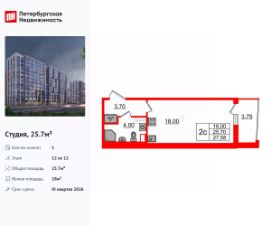 Удобная, классическая, функциональная европланировка, просторная прихожая 3.7 м². Общая площадь студии - 25.7 м², жилая  18 м², высота потолка 3 м.