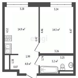 Общая площадь 38,7 кв.м. включает просторную кухню-гостиную 14,7 кв.м. и изолированную комнату 14,5 кв.м.