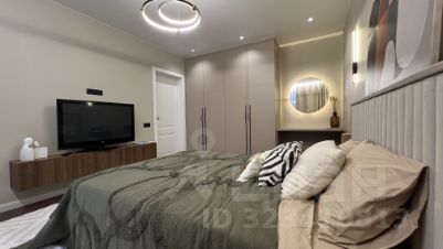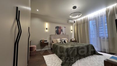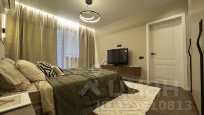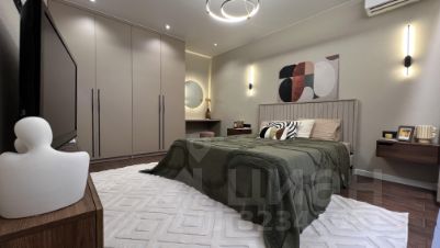• Спальня - крашенные двери с магнитным замком, двухспальная кровать, установлен кондиционер, подсветка штор, бра над кроватью, люстра и световые точки, рабочая зона со столом, небольшой банкеткой и зеркалом с подсветкой, удобные розетки и выключатели над подвесными тумбами у кровати , дубовые подоконник и порог балкона под лаком, подвесная тв тумба с местом для хранения, стильный радиатор