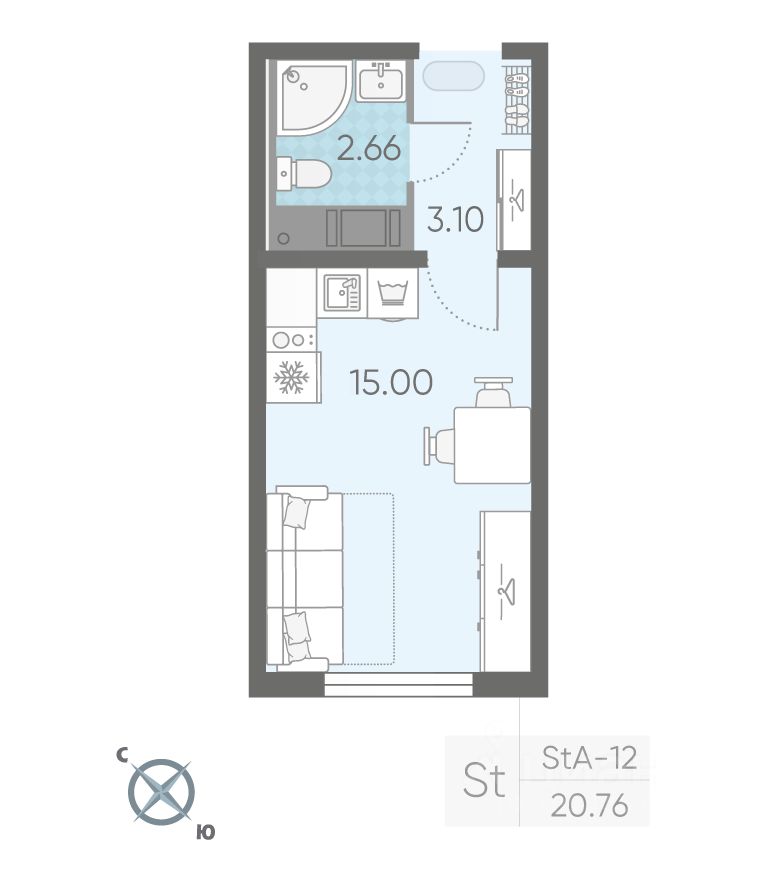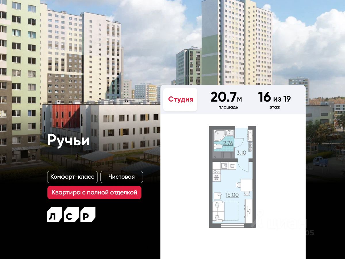 Продаётся студия в ЖК "Ручьи" на 16 этаже. Общая площадь составляет 20.70 кв. м. Квартира с чистовой отделкой. Жилой комплекс "Ручьи" располагается по адресу Санкт-Петербург, Красногвардейский.