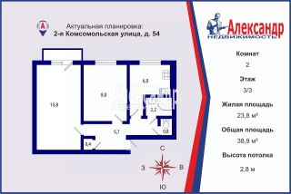 1704927 Продается уютная 2-комнатная квартира общей площадью 38,9 кв.м, расположенная на третьем этаже трехэтажного кирпичного дома, построенного в 1960 году.