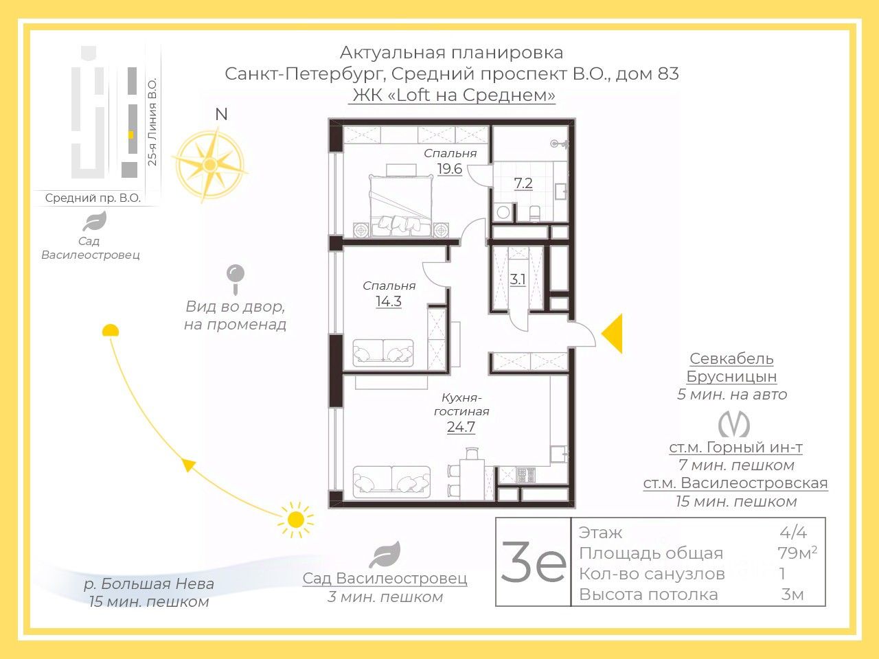 ЖК "LOFT на Среднем" - это престижный комплекс на Васильевском острове в окружении новых статусных домов. Район с развитой инфраструктурой, но без суеты центра. В шаговой доступности набережная Невы для вечерних прогулок и парк "Василеостровец". 5 минут на машине до Севкабель Порта и Брусницына.