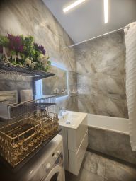 • Раздельный санузел, отделанных керамогранитом под мрамор — идеальное сочетание стиля и функциональности.