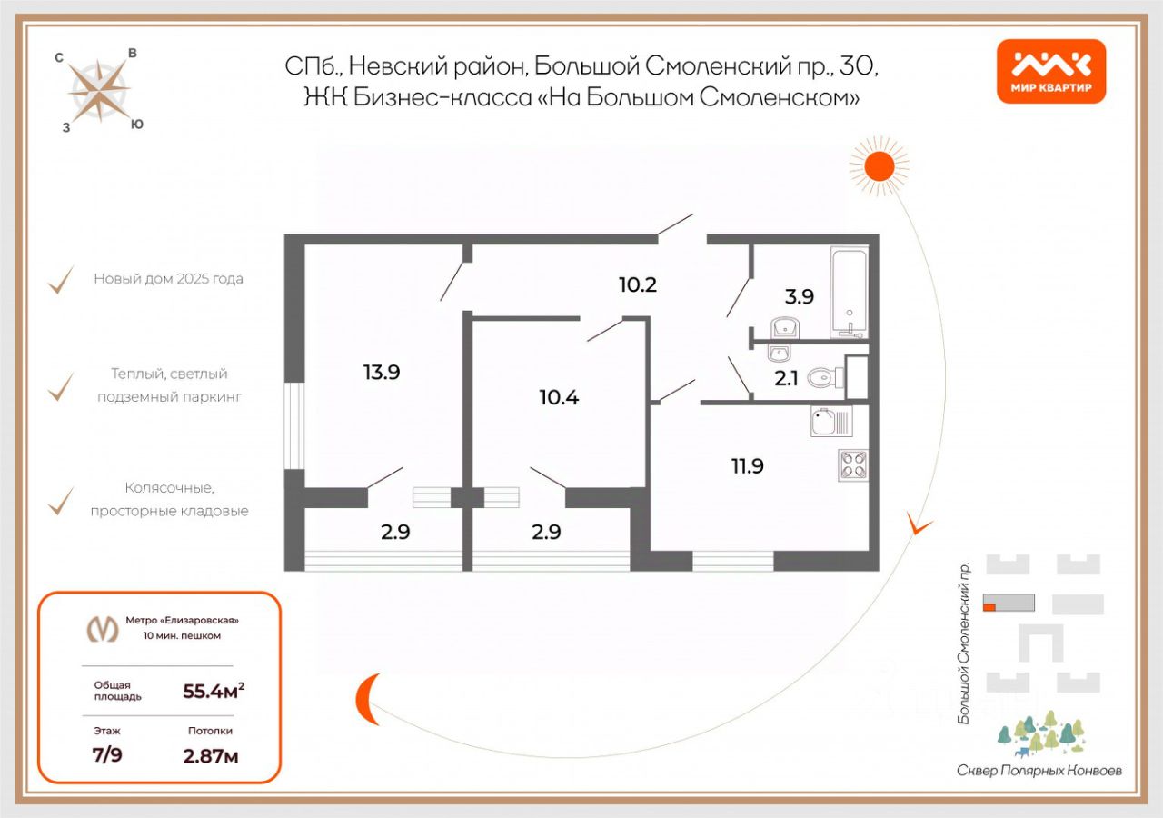 Арт. 124010491 Жилой комплекс "На Большом Смоленском" расположен в Невском районе Петербурга, всего в нескольких минутах ходьбы от метро "Елизаровская". Район активно развивается: здесь строятся современные жилые комплексы, появляются новые парки и объекты инфраструктуры, что делает локацию всё более привлекательной для жизни и инвестиций. До Невского проспекта на автомобиле всего 9 минут.
