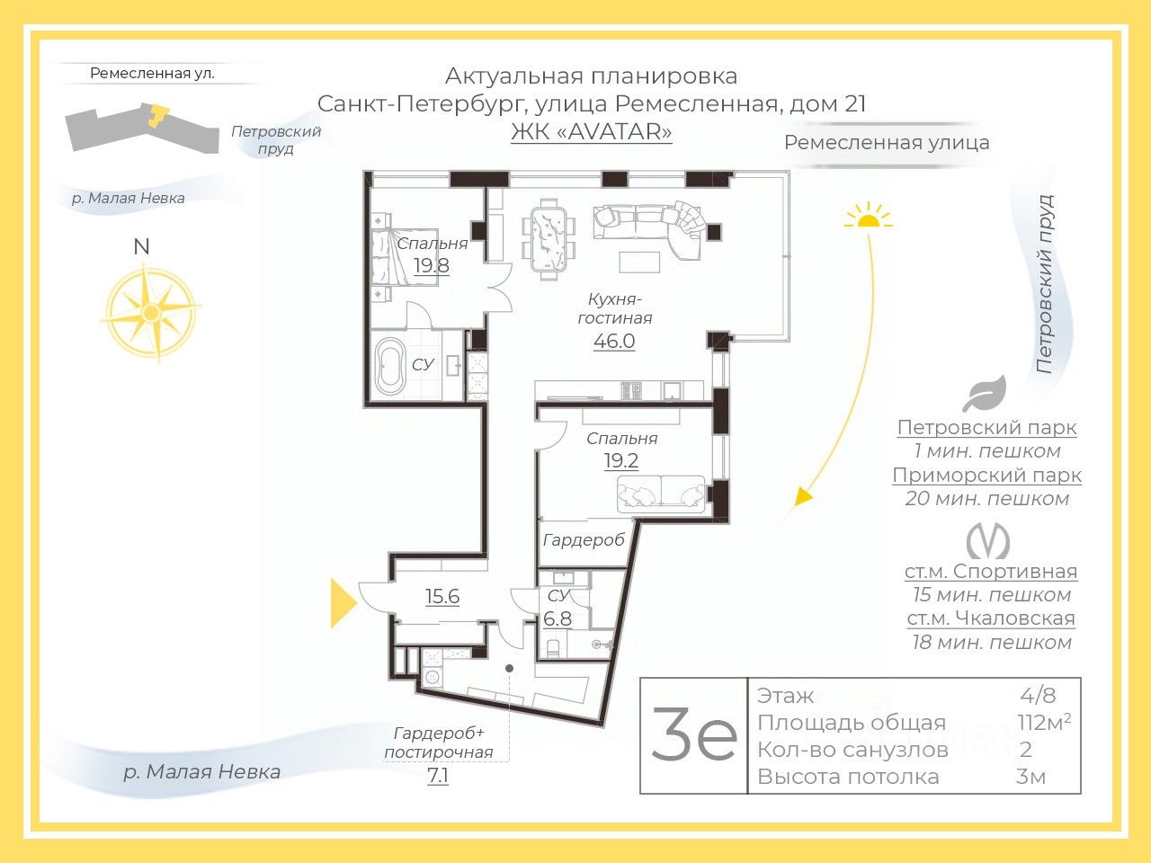 ЖК "Avatar" — камерный кирпично-монолитный дом от надежного застройщика "Строительный Трест". Круглосуточная охрана, видеонаблюдение, закрытая территория и парадная со стойкой ресепшн. Локация уникальна: всего за 7 минут вы доедете до Дворцовой площади, а в 5 минутах — парки Крестовского острова.