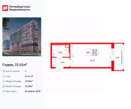 Удобная, классическая, функциональная европланировка, просторная прихожая 3.24 м². Общая площадь студии - 25.01 м², жилая 18.18 м², высота потолка 2.77 м.