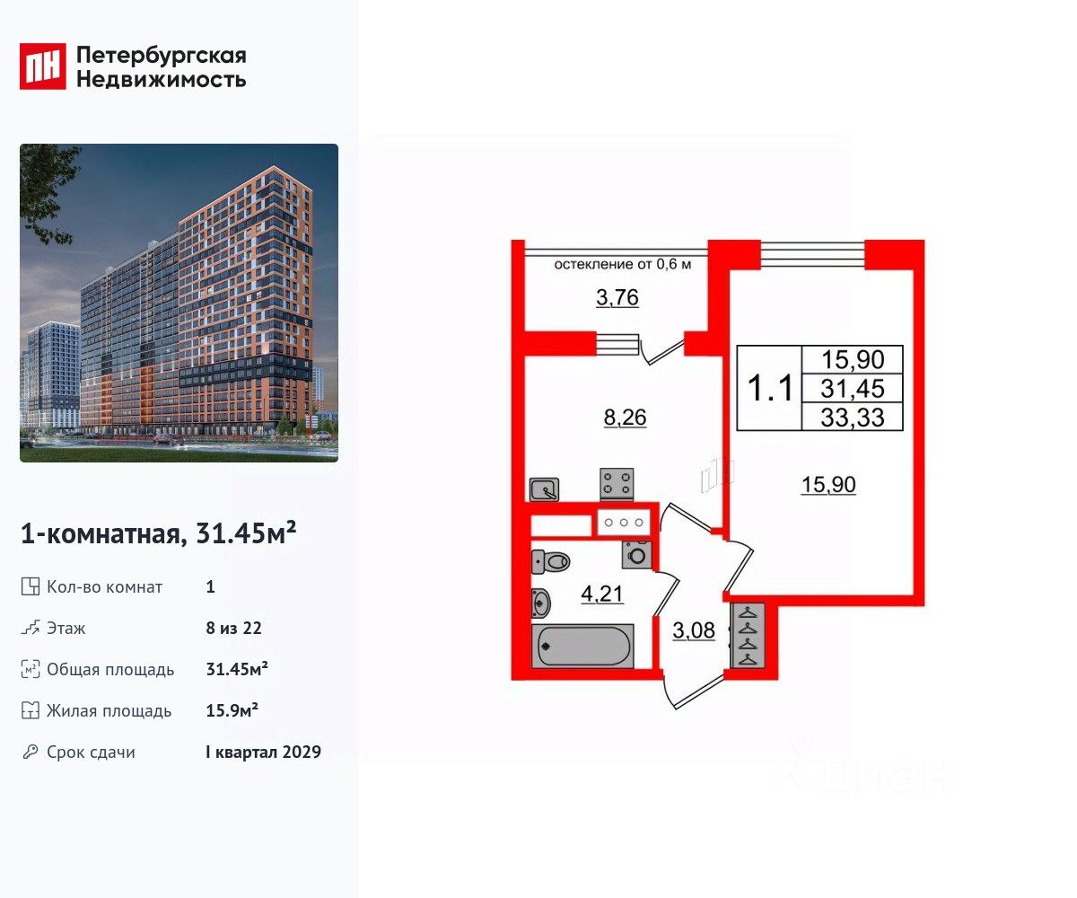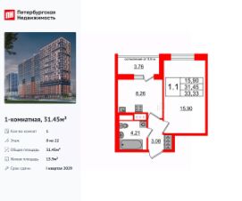 Удобная, классическая планировка, кухня 8.26 м², вместительная прихожая 3.08 м². Общая площадь квартиры - 31.45 м², жилая 15.9 м², высота потолка 2.77 м.