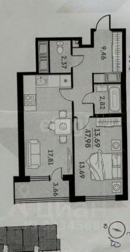 • Планировка: Евродвушка (изолированная спальня + просторная кухня-гостиная)